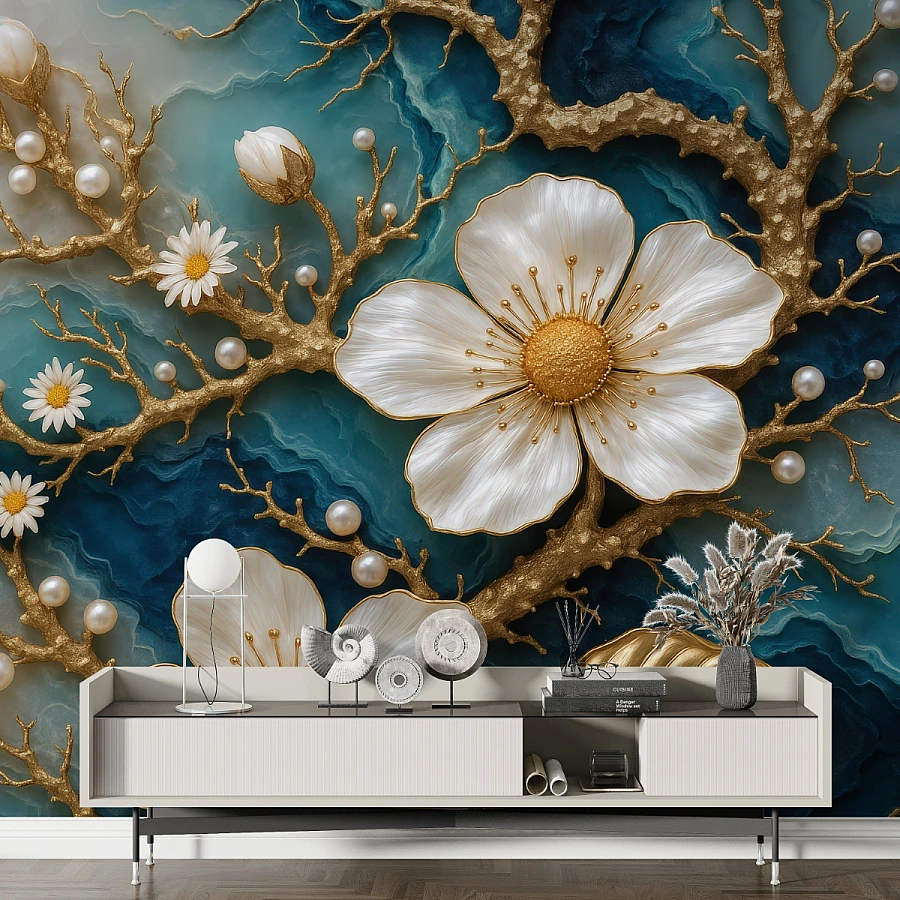 A large white blossom framed by sculptural gold branches and pearl-like accents defines this luxury floral wall mural, creating an elegant and dramatic focal point. Set against a deep blue and turquoise marbled background, the composition brings richness, depth, and a refined artistic presence to the wall.