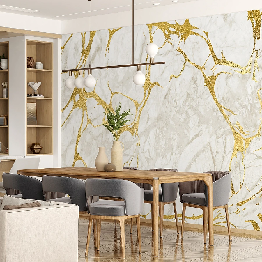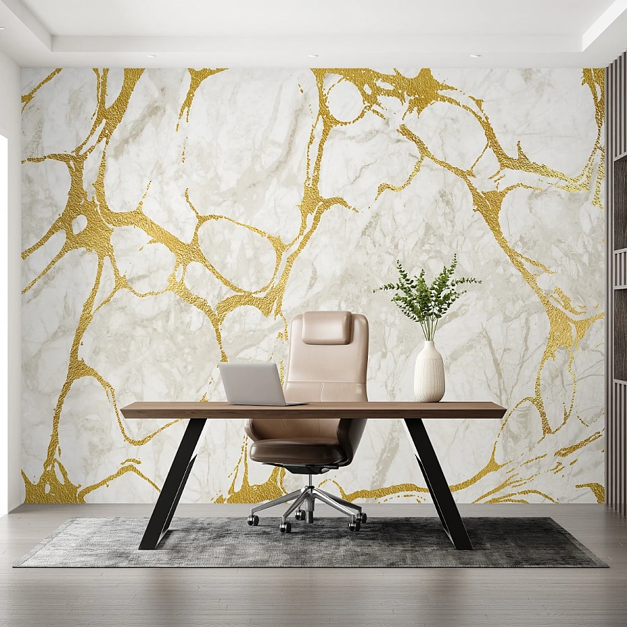 This modern luxury wallpaper combines clean marble textures with refined gold accents, creating a timeless and sophisticated look.