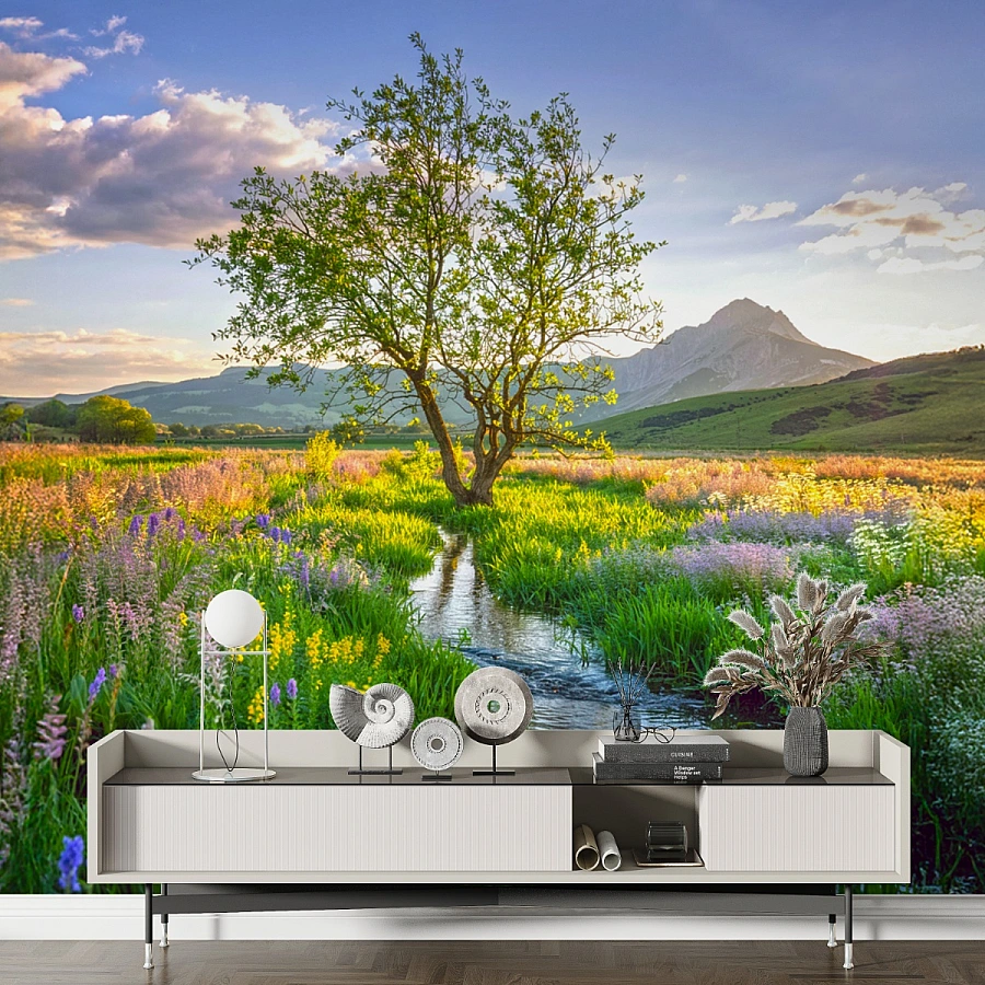 A gentle stream flows through a vibrant meadow of blooming wildflowers, leading the eye toward a lone tree set against distant mountains. Soft sunlight and expansive skies create a peaceful atmosphere, making the space feel open, fresh, and full of life.