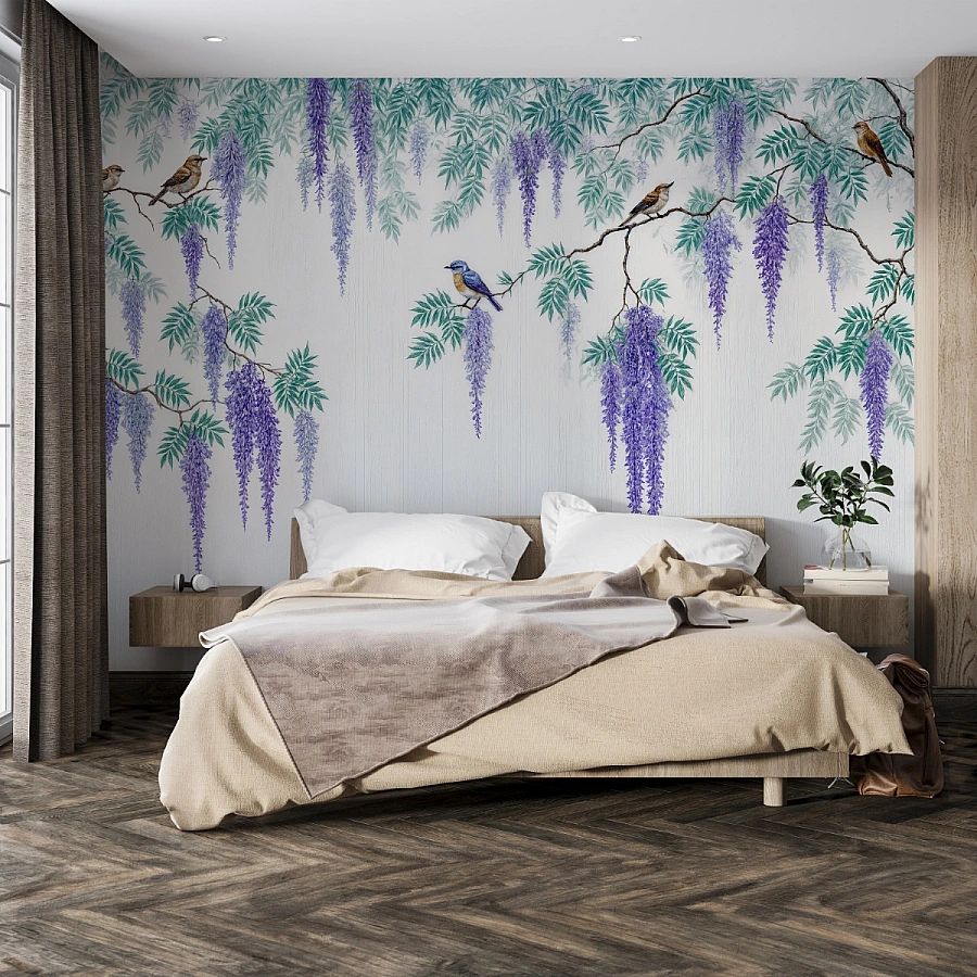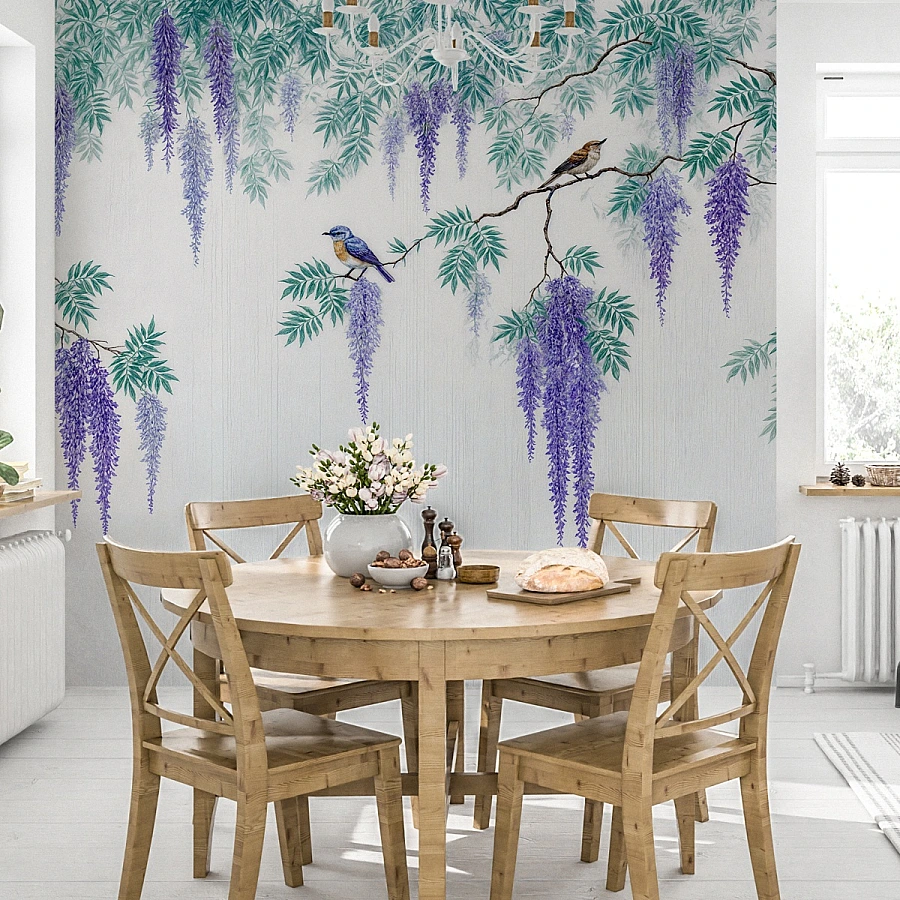 This wisteria bird wallpaper combines soft purple flowers with light green foliage and subtle neutral tones. The detailed birds add life and charm, while the airy layout keeps the design balanced, fresh, and visually soothing.