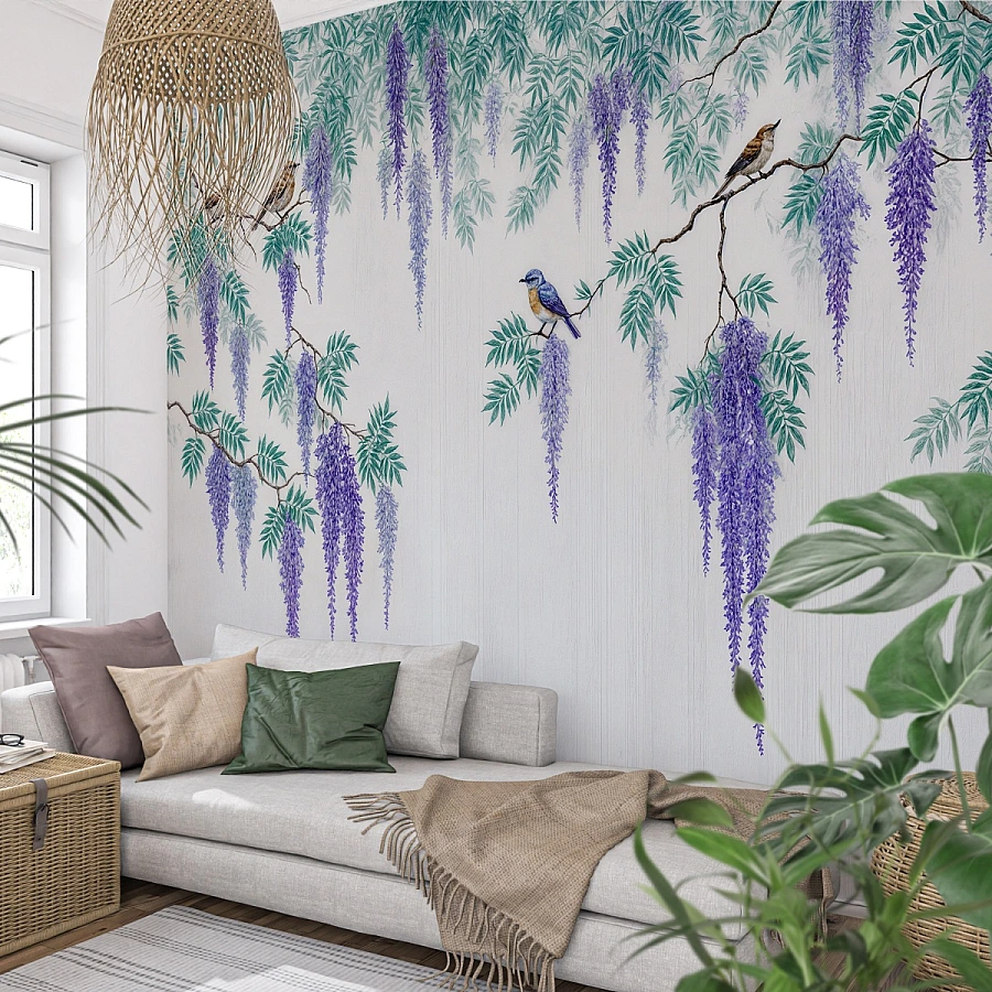 Delicate wisteria blossoms hang gracefully from fine branches, accompanied by small birds in this serene floral wall mural. The gentle composition brings a sense of calm movement and natural elegance into the space.