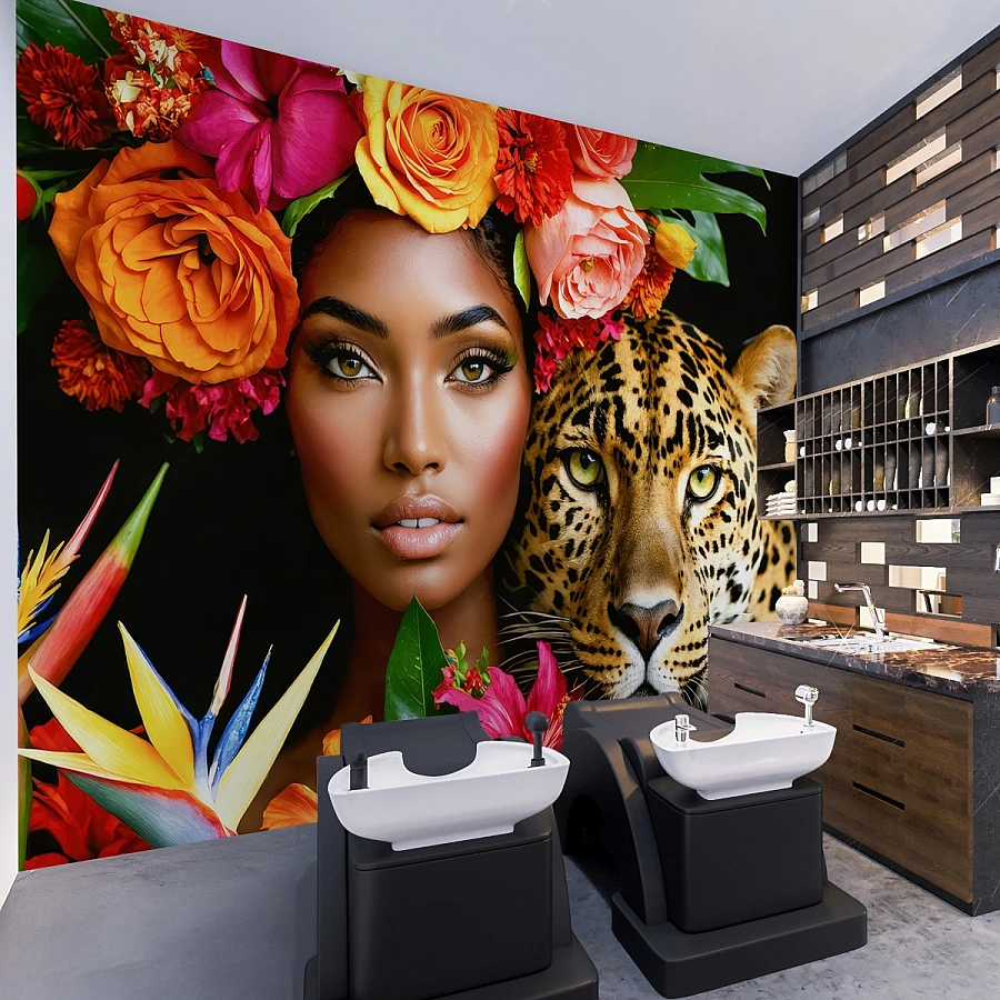 Tags: woman mural, leopard wallpaper, beauty salon wall mural, fashion wall decor, floral portrait mural, luxury wall mural