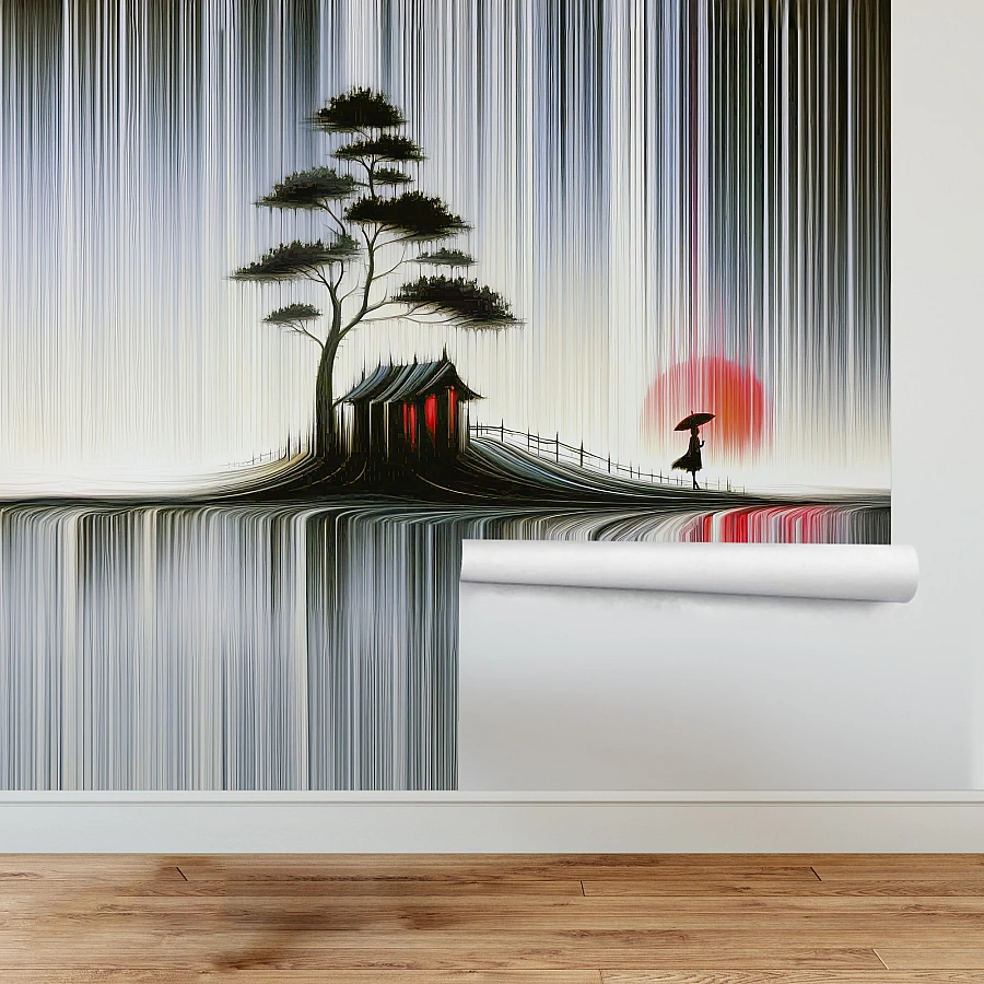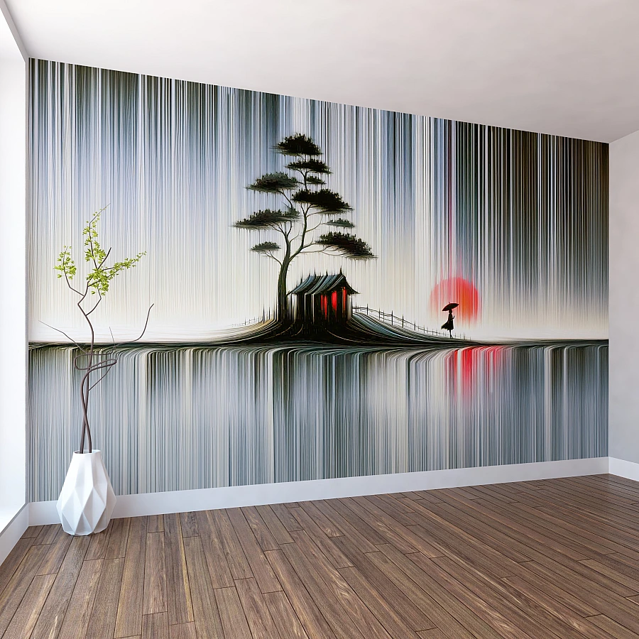 A tranquil Japanese-inspired scene emerges through flowing vertical lines in this artistic landscape wall mural. A solitary tree, small house, and distant figure create a peaceful composition enriched with subtle cultural elegance.